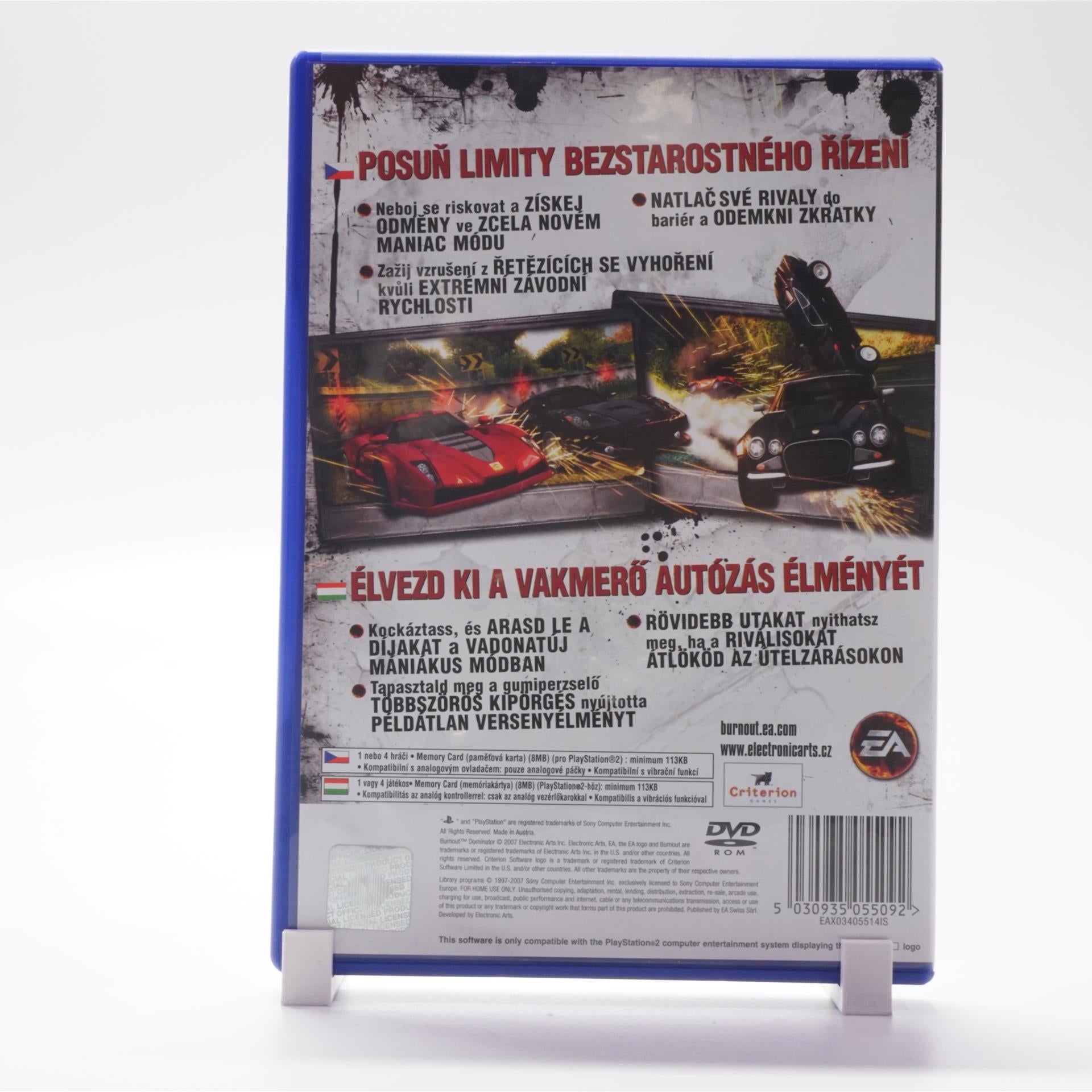 Burnout Dominator na PS2 je čistokrvná arkádová jazda zo slávnej série, ktorá odmeňuje agresívny štýl a risk. V režime World Tour prelamuješ rekordy a odomykáš nové triedy áut, trate a výzvy; kľúčom je reťaziť drifty, tesné míňania a takedowny súperov, aby si zapálil nekonečný Burnout boost a letel mestom na hranici možností. Čakajú ťa šialené rýchlosti, ikonické kolízie, rôznorodé lokality po celom svete a chytľavý soundtrack, či hráš sólo, alebo v lokálnom split-screen multiplayeri pre dvoch. Ideálne pre fanúšikov vysokooktánových pretekov a zberateľov retro titulov na PlayStation 2. Vydané v roku 2007 pod hlavičkou EA.